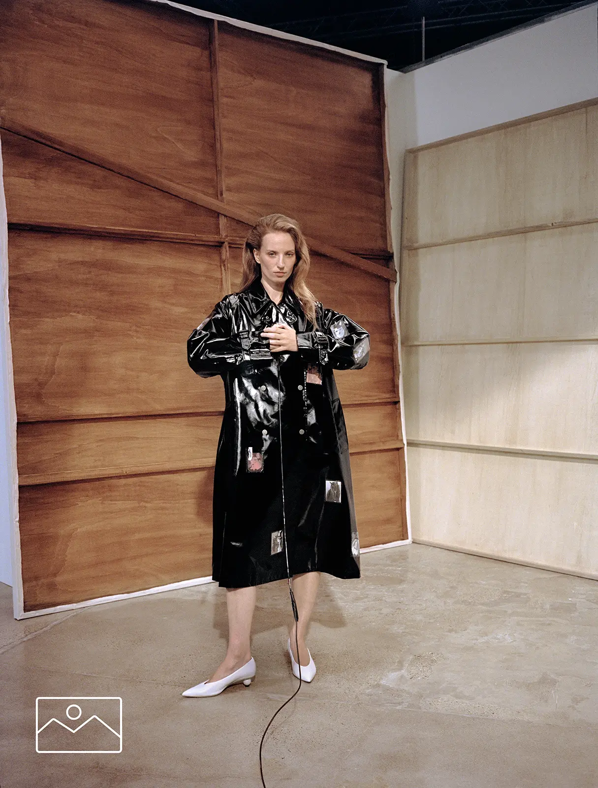I wanted to work with the trench as a sartorial symbol of both exhibitionism and clandestinity. I wanted to further fetishize this iconic garment by making it in black patent and using these little cutout images of pussy pin ups to accentuate the kind of atmospheres that this garment conjures for me. I was influenced by punk fashion that used a lot of fetish and BDSM clothing that was customised with images taken from erotic magazines and pulp fiction book covers as well as pin up photographers Bunny Yager and Paula Klaw, pioneering female pinup photographers working in the 1950s. The hand illustrated pictures are a cute wink to various traditions of erotic photography and ephemera.
