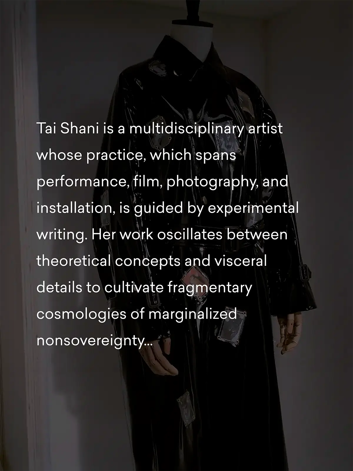 Tai Shani’s artistic practice, comprising performance, film, photography, and installation, uses experimental writing as a guiding method. Oscillating between theoretical concepts and visceral details, Shani’s texts attempt to create poetic coordinates in order to cultivate, fragmentary cosmologies of marginalised nonsovereignty. Taking cues from both mournful and undead histories of reproductive labour, illness and solidarity, her work is invested in recovering feminised aesthetic modes – such as the floral, the trippy or the gothic – in a register of utopian militancy. In this vein, the epic, in both its literary long-form and excessive affect, often shapes Shani’s approach: Her long-term projects work through historical and mythical narratives, such as Christine de Pizan’s allegorical city of women or the social history of psychedelic ergot poisoning. Extending into divergent formats and collaborations. Shani’s projects examine desire in its (infra-)structural dimension, exploring a realism that materially fantasises against the patriarchal racial capitalist present. Tai Shani is the joint 2019 Turner Prize winner together with Lawrence Abu Hamdan, Helen Cammock and Oscar Murillo. Her work has been shown extensively in Britain and internationally.