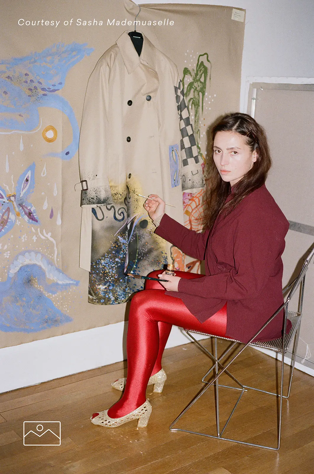 The idea for the trench coat grew out of my ongoing reflections on theatricality, the mask, and the figure of the trickster — a recurring character in my work. The trickster is a figure of transition, play, and transformation. He crosses boundaries, poses questions, but never offers clear answers. On the coat, he appears as a timeless presence — maybe observing, maybe performing, maybe already disappearing. I’m always drawn to the space between dreaming and waking, between the self and the image. To me, a trench coat is not just a garment — it’s almost like a curtain or a stage costume. It allows someone to enter a character, to try on a role, to become someone else — or to discover something more truthful through that act of play. It’s a kind of portable space where imagination takes form. Visually, I used the motif of the mask — as a symbol of duality and hidden perception — and the checkered floor, which speaks to games, strategy, contrast, tension. These elements are connected through my continuous painting technique — the line flows freely, as if alive, creating a sense of motion, illusion, a fleeting stage.